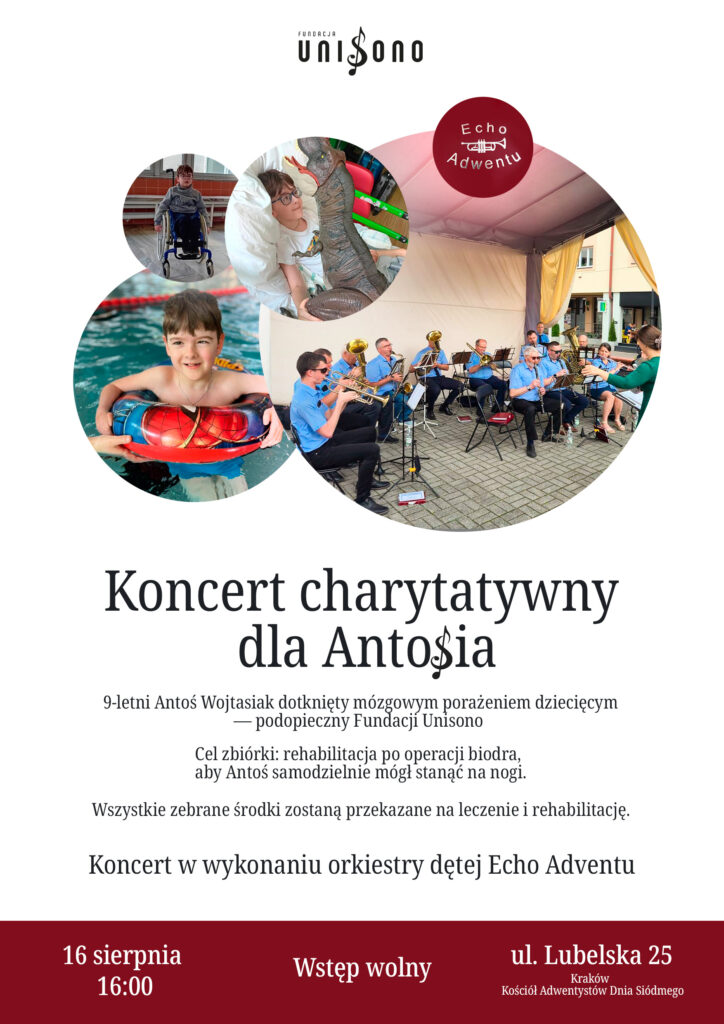 🎵 Dla Antosia zagra orkiestra dęta Echo Adwentu, a wszystkie zebrane środki zostaną przekazane na jego rehabilitację po operacji biodra – aby mógł stanąć na nogi i cieszyć się dzieciństwem bez barier.