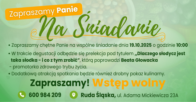 Jeśli chciałabyś miło spędzić czas poznając nowe osoby przy smacznym śniadaniu a do tego dowiedzieć się więcej o tym „Dlaczego słodycz jest taka słodka i co z tym zrobić” to zapraszamy na kolejne śniadanie dla kobiet 19 października o 10:00 do Rudy Śląskiej przy ul. Mickiewicza 23a. Temat przedstawi Beata Głowacka – promotorka zdrowego stylu życia oraz autorka bloga kulinarnego: http://swojskozfasolka.blogspot.com/ Dodatkowo poza prelekcją będzie też drobny pokaz kulinarny.